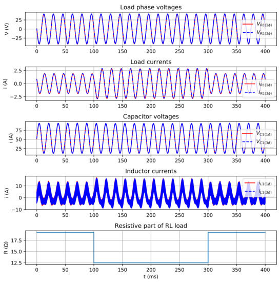 In accordance with Figure 22, the capacitor and load phase voltages remain constant during this transition. The changing in the load and inductor currents is noticed when the load impedance changes its value. This behavior is expected, once the electrical current is inversely proportional to the impedance. The simulations show that with a little change in the load impedance, even the inverter running in open-loop, there is no disturbance in the output voltage inverter for both models. This allows for the conclusion that the single-phase proposed model is able to represent the dynamic behavior of the state variables even in transient loads.