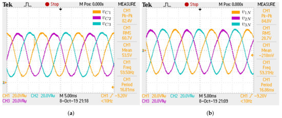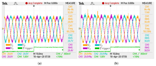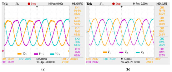 The main experimental results are shown in Figure 24a,b and Figure 25a,b in which the system operates under constant 18 resistive load. Table 5 shows the electrical quantities for the simulated single-phase and three-phase prototype.