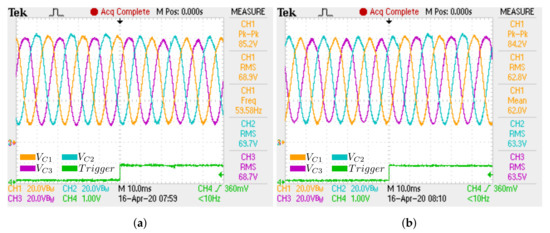 The series RL load used in this experimental case has the same parameters described in Section 4.4. Initially, it was made by a 24.7 equivalent resistance with a 22.1 mH inductor. In the first transition, the resistive part of the RL load was decreased by 10 . The waveforms of RL load phase voltages and currents in the first transition are shown in Figure 32a and Figure 33a. The waveforms for inductor currents and capacitors voltages are shown in Figure 34a and Figure 35a, respectively. In the second transition, the resistive part of the RL load backs the original value. The waveforms for load phase voltage and current, inductor currents, and capacitor voltages for the second transition are shown in Figure 32b, Figure 33b, Figure 34b and Figure 35b.