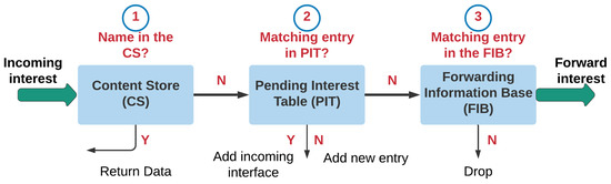 NDN introduces stateful, name-based routing and forwarding for content and information delivery. Each in-network node maintains three structures: (i) a content store (CS), (ii) a pending interest table (PIT), and (iii) a forwarding information base (FIB). NDN routers temporarily store copies of the data objects being requested by the end-users in their content stores. Users request data packets by sending out requests, namely, “interest packets”, for corresponding content. If the requested content can be retrieved locally from the CS, the incoming interest is not forwarded upstream. Record of outstanding interests is kept in the PIT which stores the names of the requested content and the incoming interfaces of the corresponding interest packets. If an incoming interest contains the name for which there is already an outstanding entry in the PIT, the interest is not forwarded upstream and the incoming interface is added against the PIT entry of that particular name. If there is no PIT entry for the requested content, the interest is forwarded upstream according to the forwarding information available in the router’s FIB. Figure 1 describes how an interest packet is processed at an NDN router.