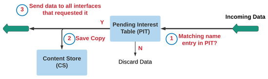 Data packets make their way to the end-users by traversing the reverse path followed by their corresponding interest packets. When a data packet arrives at an NDN router, the router performs a PIT lookup. If there is an outstanding entry for that name in the PIT, the data packet is forwarded to all the interfaces that originated the request; otherwise it is discarded. A copy of the packet is also stored temporarily in the router’s CS. Figure 2 explains how a data packet is processed at an NDN router.