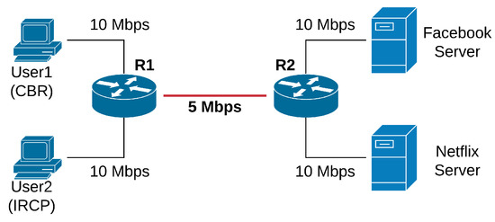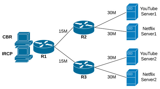 CBR flow is generating interests of the name prefix “ndn://netflix.com/” and is set to receive data at 30 Mbps, while IRCP is requesting data of the name prefix “ndn://youtube.com/”; there are two sources (data servers) for each flow, and both can satisfy incoming interest packets by providing corresponding data. An optimal load balancing technique—proposed in [23]—is active on the network routers. The routers can utilize all the available multipaths by optimally selecting the outgoing links for the forwarding of interest packets. The bottleneck links (1, 2) and (1, 3) give rise to congestion in the network, thereby causing the fairness algorithm to become active and perform per-flow interest rate shaping. In this scenario, data packets from both CBR and IRCP flows compete for their share of the bandwidth on these bottleneck links. Data reception rates for both these flows are probed at the respective receivers’ ends in order to measure their throughput.