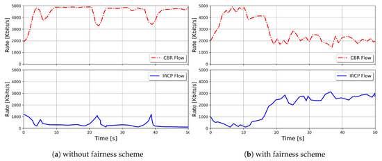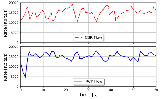 In the absence of a fairness scheme, the CBR flow causes unfair network usage as it occupies almost all of the bottleneck link throughout the simulation and does not let the IRCP flow transmit according to its fair share. The transmission (data reception) rates for both flows are displayed in Figure 4a which clearly shows that the CBR flow is occupying all the bandwidth, resulting in unfair allocation of network resources. When network congestion appears, CBR’s rate drops a little but returns to its maximum rate shortly, forcing the IRCP flow to decrease its transmission rate.