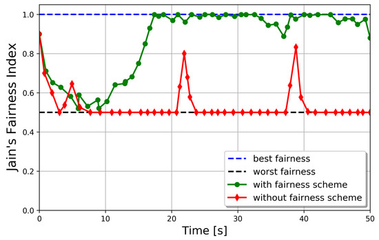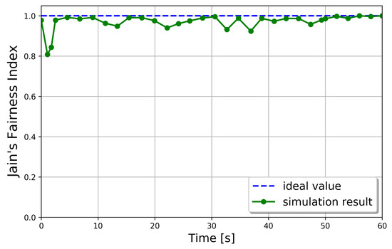 The performance of the proposed fairness scheme is depicted in Figure 5 using Jain’s fairness index, which is the measure of fairness (or lack thereof) among the active flows in a network. The index ranges between and 1 (n being the number of active flows), representing “worst” and “best” fairness respectively [31]. Since there are only two active flows: “ndn://facebook.com/” and “ndn://netflix.com/”—the fairness index ranges between 0.5 and 1.0 (representing worst and best fairness respectively). It is evident from the result that the proposed scheme is successful in achieving fairness among the active flows.