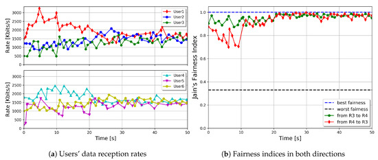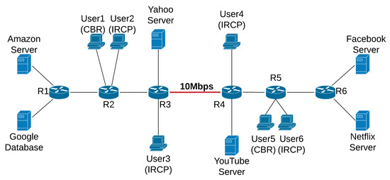 The simulation result in Figure 7a illustrates that the CBR flows originating from User1 and User4 start transmitting at a higher rate, occupying more than their fair share of the bandwidth, but the fairness scheme—deployed at the intermediate routers R3 and R4—forces them to reduce their transmission rates, consequently allowing IRCP flows (originating from User2, User3, User5, and User6) to transmit their fair share. Moreover, it is evident from Figure 7b that the bottleneck link is being shared fairly among all the network users. There are three flows competing for the bandwidth in either direction on the bottleneck link. Therefore, the lowest possible value for JFI is 1÷3, i.e., 0.33, which represents the “worst fairness” among any three users competing for the link bandwidth in either direction. It is evident from the result that the fairness indices for both directions remain far above the worst value and a near-ideal fairness is achieved and maintained throughout the simulation. This is because of the highly effective fairness scheme incorporated at the network routers, which tries to ensure that all the competing flows get to transmit the same amount of data in a specific time interval.