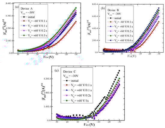 (a–c) The initial transfer characteristics of devices A, B, and C.
