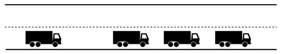 The general idea of platooning as shown in Figure 2 is to drive with a reduced distance between vehicles in order to use the slipstream of the vehicle in front [17]. The reduced air resistance reduces fuel consumption and the carrier saves money [18]. Therefore, two or more agents are involved, following each other on the motorway. In the short term, the urgency and potential cost savings are very low, but with consistent operation over long distances, fuel savings of up to 10% can be achieved [19]. The type of interaction depends on the position in the platoon; the leading vehicle has a passive role and only exchanges information, especially about its braking maneuvers. This is necessary so that the following vehicles can drive at a reduced distance and react quickly to a breaking situation, thereby performing active maneuvers. This form of cooperation is mutual in the sense that it benefits all agents involved, although the fuel savings for the leading vehicle are significantly lower than for the vehicles in the slipstream. Therefore, although all agents benefit, the benefits are not fairly distributed. A platoon can be formed spontaneously on the motorway or planned well in advance to ensure that two suitable trucks actually meet on the freeway. In both cases, the time available to prepare the cooperation is long and there is no urgency. The biggest profiteer is a following vehicle that wants to enter the platoon, so one can assume that this vehicle should initiate the cooperation and request the transmission of the signals. However, it is also conceivable that a central authority, e.g., a fleet manager of the carrier, initiates the cooperation and forces the vehicles into a platoon.