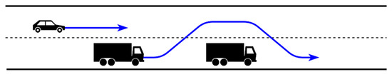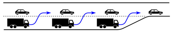 In the drive-on scenario or generally in lane-merging scenarios as depicted in Figure 3, the idea is to create fairness by alternately merging vehicles from both lanes, creating a zipper-like pattern [11,20]. Although there may be many vehicles in such a scenario, in most cases only two agents of any type will be involved in the actual cooperation. The location of the cooperation is limited to the drive-up area, and for some vehicles, especially slow trucks, the urgency of the cooperation may be high, as otherwise a braking maneuver must be initiated. When cooperation takes place, it is an active form of cooperation for all agents involved, since the cooperation partner on the freeway adjusts his trajectory so that the profiteer on the driveway can choose a better trajectory. Therefore, it is clear that the cooperation is not mutual, and the grantor accepts costs with an altruistic interaction to enable the profiteer to save (much higher) costs. Since both the duration and the preparation time are short and limited to the time in the drive-up area, all costs incurred can be regarded as one-time expenses. In the long run, however, further costs could arise, e.g., if a very slow vehicle is allowed in front of one’s own vehicle. The initialization depends on the vehicle strategy and two possible variants are that the granter proactively offers cooperation or that the profiteer sends a cooperation request.