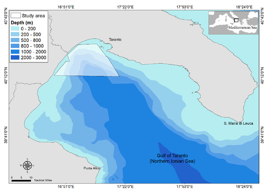 Map of the Gulf of Taranto (Northern Ionian Sea, Central-Eastern Mediterranean Sea) with indication of the survey area investigated from 2013 to 2018.