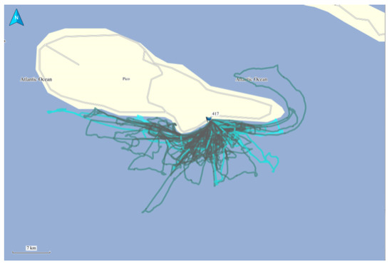 The second study area took place off Pico Island, one of the nine islands belonging to the Archipelago of the Azores (Portugal) (see Figure 2). The islands are separated by deep waters (ca. 2000 m) with scattered seamounts [50], stretching-out over 480 km, overlapping the Mid-Atlantic Ridge. The Gulf Stream, the North Atlantic and Azores currents (and their branches) are responsible for the complex pattern of ocean circulation that characterizes the Azores, and result in the high salinity, high temperature and low nutrient regime waters [51]. Due to the upwelling of nutrient-rich deep water currents, the runoff from land and the complex and dynamic oceanic circulation patterns, the area constitutes a food-rich oasis in the oligotrophic central North Atlantic. It concerns a coastal marine habitat where coastal, pelagic and deep-water ecosystems can be found in close vicinity of each other, resulting in a species-rich and highly diverse marine ecosystem [52]. Due to the absence of a continental shelf and the steep marine walls, over 25 cetacean species, including Risso’s dolphins can be often found close to shore [53,54].