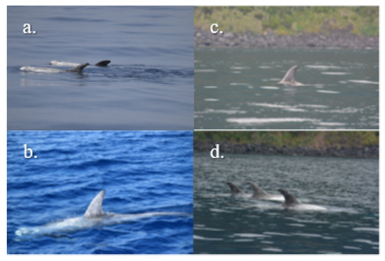 Pictures collected at item number 2 have been obtained off Pico island, covering approximately 540 km during 2018. Risso’s dolphins were first located from a land based look out (38.4078 N and 28.1880 W) using binoculars (Steiner observer) [56] and encountered during ocean based surveys, using a 5.8 m long zodiac, equipped with a 50 HP outboard engine. Examples of the images are shown in Figure 3.