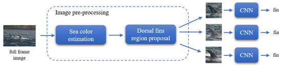 Before carrying on photo-ID investigations, the crop of the interesting image portions that depict a dorsal fin must be done [26]. Figure 4 shows the block diagram of the proposed two-stage solution where it is immediate to see that a full frame image needs to be pre-processed and cropped in order to be subsequently used in an effective way. The two steps involved are the following: