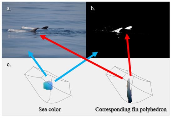 Example of segmentation: (a) original image, (b) binary mask obtained. White areas are candidate to be fins. (c) Qualitative visualization of a model in terms of sea color and fin polyhedron. The blue arrows refer to the masked background, the red ones highlight the polyhedron responsible for masking the candidate fins.