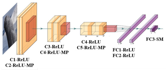 CNN architecture and processing stages of a single image. The yellow-orange blocks represent the convolution and pooling layers, while the purple blocks represent the final classification layers. C is used for Convolutional Layers, ReLU for Rectified Linear Units, MP for Max Pooling, FC for Fully Connected Layers and SM for SoftMax.