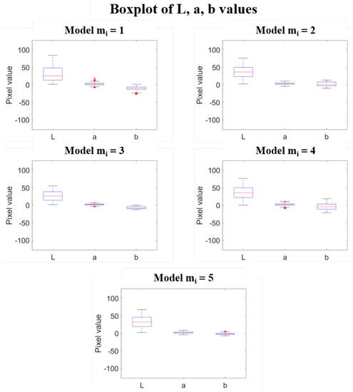 Boxplot of L, a and b values used to define the 3D polyhedra for each model.
