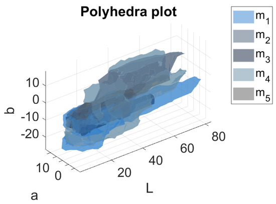Table 1 shows the details of the five sea color sets that have been identified in the experiment. It is immediate to notice the variability of the data that reflects the need of defining multiple sea models. As pointed out before, these thresholds are highly dependent on the experimental setup used to capture the images as well as on the weather conditions during the acquisition campaigns. It is worth noting at this point that the choice of is a way of ensuring the convergence of the Algorithm 1 with respect to the dataset considered and to the supervised evaluation procedure described in the section Color models update. The fin color sets obtained are reported in Table 2 in terms of median values and median absolute distances of L, a and b coordinates. The corresponding boxplot, shown for each model in Figure 7, show a slight but clear difference in the appearance of the fin for the five models, with different ranges for the three components, especially the b one, that is largest in the case of . Moreover, the statistics highlight the presence of outliers for a and b components in all the models except for , that correspond to large polyhedra in the Lab space, as shown in Figure 8.