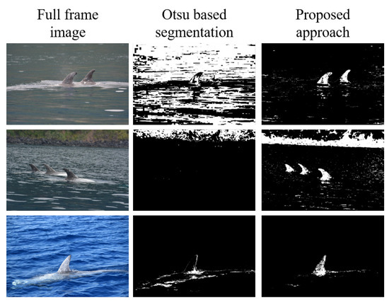 Otsu’s segmentation was successfully applied to segment the dorsal fin from the sea in [17]. However, the results of applying this technique on a small subset of the dataset shown that more than 50% of images have been discarded, thus making unfeasible the automatic crop. This is due to the fact that the two binary thresholds on L and b channels are not enough to fulfill the requirement of clearly identify the region of interest that depicts a dorsal fin. Figure 10 shows examples of unusable images obtained with Otsu’s algorithm.