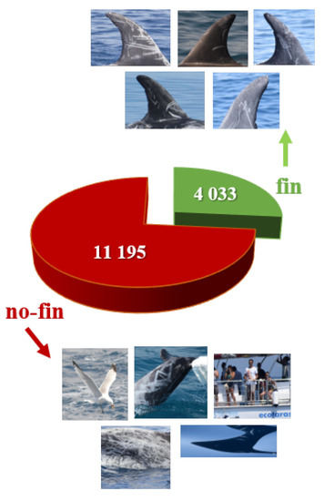 Experiment number 2 is focused on the CNN training and validation that has been performed using the first part of the dataset, i.e., pictures taken in the Gulf of Taranto (Jonian Sea) between 2013 and 2018. Starting from the images, a total number of 15,228 crops have been identified, sub-divided in 4033 fin and 11195 no-fin, as shown in Figure 11. Data have been manually labeled and full frame images showing more than one fin have been used to produce multiple cropped fins.