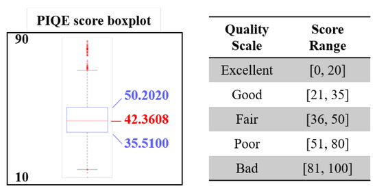 Perception based Image Quality Evaluator (PIQE) score boxplot (lower is better) computed on the Azores validation dataset. The quality of the cropped images that are used to validate the CNN proposed in this work range from 11.6928 (excellent) to 89.5572 (bad). The median value is shown in red 42.3608 (fair).