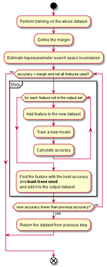 A block diagram of our proposed method is presented in the Figure 1. First three blocks serve as the preparation phase: training of the classifier on the whole dataset, defining the margin that defines the terminating condition for the main loop and estimation of the hyperparameter search space size. Then, in the main loop, at each repetition (“Step”), all the features are used for training and the feature that yields the best prediction quality is selected for inclusion into the output dataset. The main loop ends when the achieved prediction quality reaches the margin. More detailed description of the algorithm follows in the Section 2.4.