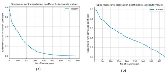 Absolute values of Spearman’s rank correlation coefficients of all distinct feature pairs, ordered by their value in descending order: (a) from the Network Security Laboratory of University of New Brunswick, Canada (NSL-KDD) dataset; (b) from the UCI Breast Cancer Wisconsin Dataset (UCI-BCW) dataset.