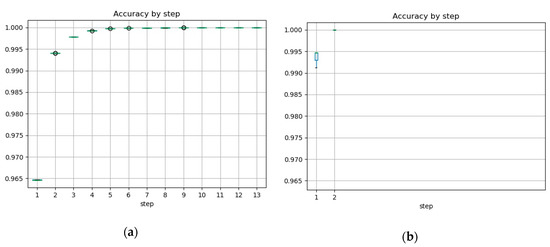 Accuracy of the trained models at each step, shown as boxplots: (a) from the NSL-KDD dataset; (b) from the UCI-BCW dataset.