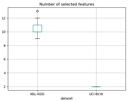 In case of the NSL-KDD dataset, number of selected features was varying among runs from nine to 13, whereas in case of UCI_BCW dataset, it was consistently two. The Figure 5 displays these numbers as a pair of boxplots to provide a statistical information about them.