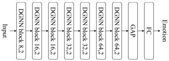 As a result, G contains geometric information of facial emotions. However, in our research, using a set of triangular meshes was not sufficient to extract emotional information. In a graph structure, geometric information is propagated through edges. However, a graph structure is built using landmarks. Therefore, the structure is larger and more complicated than other graphs used in computer vision tasks, such as for the skeleton. Due to this difficulty, in this structure, it is hard to propagate information from vertex to far distant vertex.