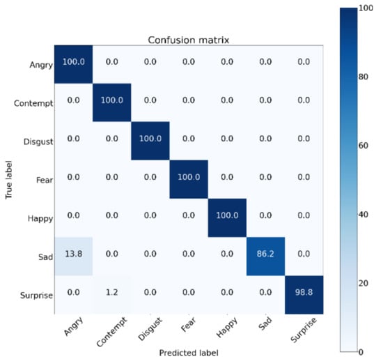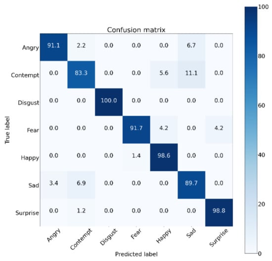 In this section, we show experimental results for the CK+ dataset. The CK+ dataset is mainly used for emotion recognition research. It is composed of 327 video sequences presenting seven emotional labels, i.e., anger, contempt, disgust, fear, happiness, sadness, and surprise. Also, all videos contain frontal face images without disturbing elements such as strong illumination and different faces. Due to these characteristics, our landmark extractor could extract precise landmarks’ locations and provide excellent information to the DGNN. The experimental results are shown in