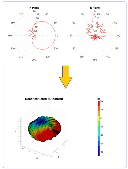 where n is the number of active RBSs. Regarding the transmitter antenna gain, it must be included in the model. In this work, the term G(θ,φ) was derived with the knowledge of the horizontal and vertical radiation patterns, which are provided by the manufacturers in the datasheets. Typically, the fields for the main E- and H-planes are known. However, the estimation of the electric field should be performed for a given arbitrary point. It is therefore necessary to derive the entire radiation pattern. Among the available methods, in this work, the gain of the transmitting antenna is used as input to the 3D interpolation algorithm from [25,26] in order to derive the full pattern and hence calculate the field levels in a given point. An explicative scheme of the reconstruction procedure is shown in Figure 1 for the case of a Kathrein 742212 antenna.