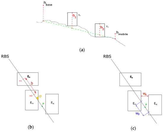 New definition of parameters for the COST231–Walfisch–Ikegami model [24]: (a) Schematic drawing of the re-defined parameter hroof to account for the hilliness of a given urban scenario; (b) Representation of the two possible definitions of parameter w. In this work, the definition w = wp is used [24]. (c) Definition and representation of the parameters b and φ. The rectangular boxes, named respectively, En, Em, and Ek, are the buildings crossed by the electromagnetic field during its propagation path from the RBS (see label in black) to the point P (see label in green). In addition, hbase, hmobile, and h1,2 represent the RBS height, the point P height, and the building height, respectively. Finally, the w, b, and φ parameters are the width of the roads in the built-up area, the building separation, and the road orientation with respect to the radio path, respectively