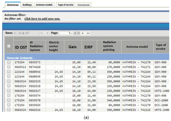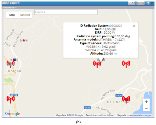 Examples of the web app of the Onde Chiare system. (a) The register of antennas contains information related to the position, the identification number, the height, the gain, the nominal power, the pointing direction, the antenna type, and the working frequency band. (b) The web app provides the actual location of the RBS in the region of interest, with the full set of information.