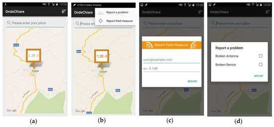 The Onde Chiare app is a prototype designed for Android devices that was tested internally at the University of Cagliari [28]. Figure 5a shows the app main screen; it offers the possibility for each mobile device owner to become part of a network of distributed information made up of citizens interested in environmental issues. Indeed, the active participation of citizens has a fundamental role. The Onde Chiare app is an application that enables the community to promote a proper form of active involvement of citizens and real-time information sharing of electromagnetic field levels in a given geographical area. This mobile application provides some services such as: