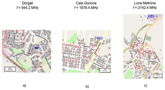 The measurements were performed in the three UHF bands of interest. In particular, in the town of Dorgali (NU), the electric field levels were measured in the GSM band, at 944.2 MHz in the set of points shown in Figure 6a. For the frequency of 1847.8 MHz, the site of Cala Gonone (NU), presented in Figure 6b, was considered. Finally, the 4G coverage (2142.4 MHz) and exposure were assessed in the town of Lunamatrona (CA) in Sardinia (Italy), as shown in Figure 6c. Regarding the highest frequency band, a remark is in order. The C231WI model is known to be limited to an upper frequency bound of 2 GHz. This is a nominal constraint, but, in this work, relying on the method of [24], we corroborated the possibility of using the C231WI model at 2150 GHz with reasonable accuracy. At each site, the measurements were carried out using a YAGI antenna for both the 1.8 GHz and 2.15 GHz bands. On the other hand, a log-periodic antenna (LPDA) was used for the 900 MHz band. A tripod was used to position the antenna 1.5 m above ground. A Rohde-Schwarz FSH8 spectrum analyzer, operating from 9 kHz to 8 GHz and with an input impedance of 50 Ohm, was used to measure the electric field. Given the daily periodic pattern of the transmitted RBS power [32,33], which follows the traffic load and present variations of about 8–9 dBm between day and night [34], all the measurements were performed during the traffic peak hours [32]. At least 15 measurement points were selected for each location, and their position, as well the RBS location.