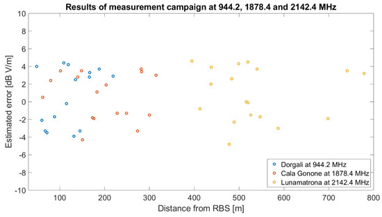 In order to highlight that the new definitions of the model parameters which describe the set of buildings involved in the propagation between the RBS and the mobile are pivotal for the case of small, hilly towns with a significant variability in the topology and environment, it is worth noting that an accuracy equivalent to the one claimed by the original C231WI in the case of large and almost homogenous cities is obtained [4]. In other words, with the results from Table 2 to 4, it is demonstrated that the modified version of the C231WI model and the OCS perform similarly to the original model, but for a worst and complex case. We have summarized these findings in Figure 7 in order to present the model and system performances against the distance from the RBS and the working frequency. The error of the estimated field level oscillates randomly with the distance from the RBS. However, from Figure 7 it can be noticed that for the three sites, the distribution of the error is similar for the three built-up areas of interest. This implies that the prediction error is similar across the UHF frequency band considered in this work. By remembering that the original C231WI model was developed to work at a maximum frequency of 2 GHz [4,25], the findings from Figure 7 corroborate the possibility of extending the model to higher frequency as long as its parameters are modified, as explained in Section 2. As a conclusion, the validation campaign demonstrated that the modified version of the C231WI model and the Onde Chiare system are effective, accurate, and reliable tools for the prediction of EM field levels in irregular, hilly built-up areas, thus being a technological solution for companies from the telecommunication system or for local regulatory agencies.