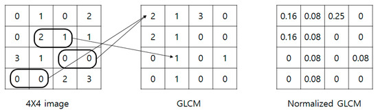 Figure 1 shows an example of a GLCM. Assuming that a 4 × 4 image is the gray level information of the original image. If there are 4 known stages as stages 0–3, the GLCM is created as a 4 × 4 matrix. The GLCM in the Figure 1 was created by grouping the values of the original image horizontally in twos. For example, the original image’s (4 × 4 image in Figure 1) (2(row), 2(column)) and (2(row), 3(column)) values are 2 and 1, respectively, and the combination of (2, 1) is just one case in the 4 × 4 image. Thus, this is converted to GLCM as 1 value in (2, 1). The value of the GLCM (0, 0) is 2, and this is because there are 2 pairs of (0, 0) in the original image. One characteristic of the GLCM is that the sum of the GLCM found by the same method is always the same. The sum of the values of the GLCM in the figure is 12, as there is a total of 12 pairs in the original image. Therefore, even if the original image’s values change, the sum of the GLCM’s values is fixed as the GLCM is created by grouping pairs. The figure’s normalized GLCM is normalized by dividing each GLCM value by 12, which is the sum.