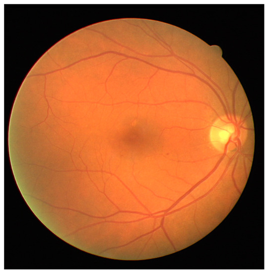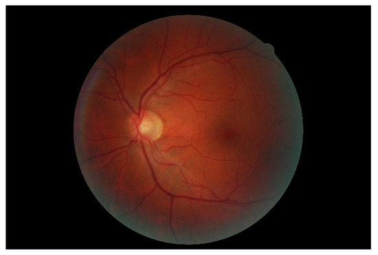 Retina images are digital images of the interior of the eye, specifically the rear portion. Retina images are required to show the retina, optic disk, and blood vessels, as shown in Figure 2. Figure 2 shows a retina image from the digital retinal images for vessel extraction (DRIVE) [59] dataset, which is often used in retina-related studies.