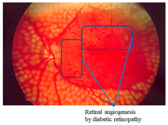 Many studies have endeavored to automate the extraction of vessels from retina images and to improve the efficiency and accuracy of retinal diagnoses [43]. If a retinal image’s quality is low, the state of the patient’s retina cannot be sufficiently reflected. For example, in the case of diabetic retinopathy, which is the world’s most common diabetic eye disease and a major cause of blindness, one of the criteria for diagnosing the progress of the disease is angiogenesis, in which tiny new vessels grow due to vessel occlusion. If the image quality is low, very fine angiogenesis cannot be seen. Figure 3 shows angiogenesis that has occurred due to diabetic retinopathy. When the resolution of a retinal examination’s output images is poor, considerable money may be spent on readily requesting images for reconfirmation. When a patient with expert knowledge of the eyes has doubts about the physician’s diagnosis regarding their retina images, clear retina images can act as a basis for a re-diagnosis. They may also be helpful in future studies for automating retina image-based diagnostics. However, if the patient does not readily receive high-quality images, the value of the retinal examination may be negligible, and the examination results may be questionable.