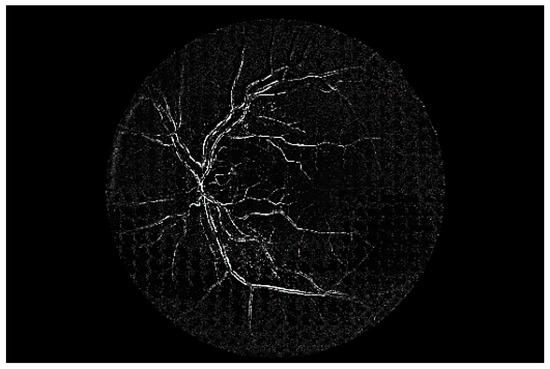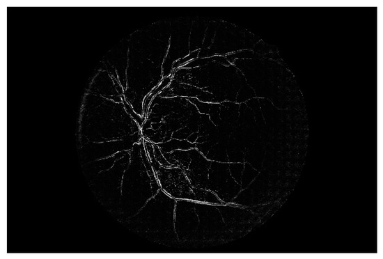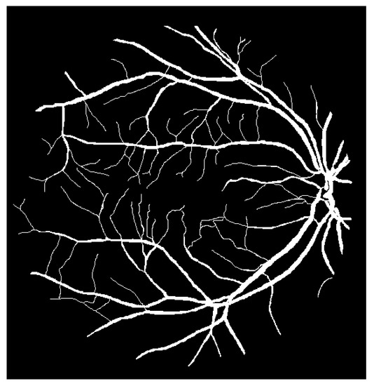 The techniques that are often used for automating retinal vessel segmentation are based on machine learning [28,29,30,31,32,33,34,35,36,37,38,39,40,41,42,43,44,45,46]. This is because replacing the lost vessel portion of an original retina image with another person’s vessels lacks ethical credibility. On the other hand, machine learning is credible because it learns patterns in which people’s vessels are spread. The focus of most recent studies is on deep learning-based supervised learning, and this is the same for retinal vessel segmentation automation. To learn vessel images, masks must be prepared in advance for the vessel portion. Figure 4 shows the manually prepared vessel portion of Figure 2. Moreover, the areas of the vessels must be specified when the dataset’s retina images are in a different environment (minor changes in position that occur when the image is captured). Figure 5 shows the position mask for Figure 2.