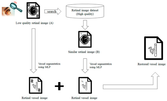 To perform an accurate retinal diagnosis, it is necessary to clearly see the retinal vessels in the images obtained by a retinal examination. Figure 6 illustrates the overall approach. Let us assume that low-quality retinal images (A) have been obtained from a simple retinal examination, such as direct ophthalmoscopy. Low-quality images usually contain blurry portions with clear portions in several parts. Therefore, vessel segmentation is performed only in the clear portions. The low-quality image (A) is used to retrieve the most similar image (B) in the dataset that includes high-quality (clear) vessels, and vessel segmentation is also performed on the retrieved clear image (B). Note that vessel segmentation should only be performed on the clear portions of B (the blurry portions of A). Finally, the identified vessel images are combined to generate a high-resolution image for an accurate retinal diagnosis.