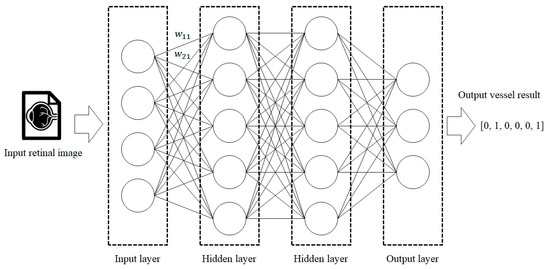 During this stage, vessel segmentation is performed on the low-quality (low-resolution) retina and similar images. MLP, which uses an artificial neural network algorithm based on supervised learning, is employed for the vessel segmentation. Since MLP is a universal approximator, all functions can be represented if the MLP model consists of a large enough number of neurons and layers. It is also better to find an accurate weight value for every pixel instead of extracting partial features, as the retina images of the people having an average retina are not that different.