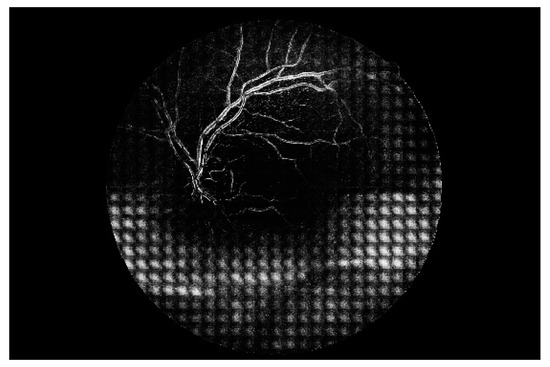 Figure 7 shows a simple example of the MLP method used in this study. The high-resolution fundus (HRF) [74] image dataset contains higher-quality retinal images compared to those of DRIVE, and provides both low- and high-quality retinal images. Figure 8 shows a low-quality retinal image. The bottom part of the image is unclear owing to white noise caused by environmental factors. Figure 9 shows a retinal vessel image created by performing vessel segmentation on Figure 8. The white noise seen in Figure 8 also affects vessel segmentation. Figure 10 is a high-quality retinal image and the white noise observed in Figure 8 has disappeared. The bottom part of the vessel stem is clearly visible, which did not appear in the original image. Figure 11 shows a retinal vessel image created by performing vessel segmentation on Figure 10. Unlike Figure 9, the bottom part of the vessel stem is shown clearly.