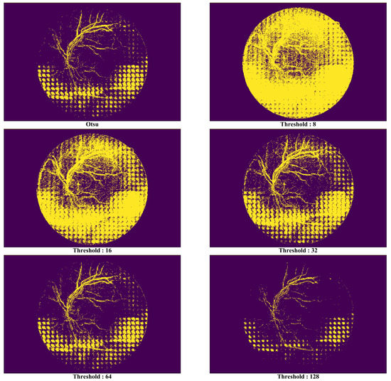 Algorithm 1 shows the procedure of the proposed technique. As inputs of the algorithm, is a set of low-quality images in which the user expects to increase quality, and is a set of high-quality retinal image data collected to improve the quality of . Lines 4–10 show the process of finding an image similar to a low-quality retinal image in a data collection. Haralick similarity is used to find the image with the highest similarity to the input low-quality retinal image. The searched similar image is a source of good pixels to replace bad pixels (pixels that cause deterioration in quality) of the original image. This process is covered in detail in Section 4.1. Lines 11–12 show the process of dividing the blood vessel from the retinal image. The blood vessel is divided based on the learned MLP using the DRIVE dataset. This process is covered in detail in Section 4.2. Lines 13–26 show the process of creating a synthesized image by applying a mask. A threshold is used to create a mask with the criteria of noise to be properly removed. In our approach, the Otsu method [60,61,62,63,64,65,66,67,68,69] is applied to dynamically select the threshold. After the mask generation is completed, a pixel value is determined for each pixel of the mask. If the pixel value is 0, the pixel of the original image is fetched, and if 1, the pixel of the similar image is fetched. The final synthesized results are returned as a set. This process is covered in detail in Section 4.3.