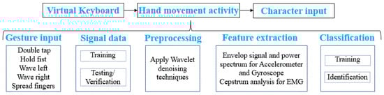 Nowadays, gesture-based technology is revolutionizing the world and lifestyles, and the users are comfortable and care about their needs, for example, in communication, information security, the convenience of day-to-day operations and so forth. In this case, hand movement information provides an alternative way for users to interact with people, machines or robots. Therefore, this paper presents a character input system using a virtual keyboard based on the analysis of hand movements. We analyzed the signals of the accelerometer, gyroscope, and electromyography (EMG) for movement activity. We explored potential features of removing noise from input signals through the wavelet denoising technique. The envelope spectrum is used for the analysis of the accelerometer and gyroscope and cepstrum for the EMG signal. Furthermore, the support vector machine (SVM) is used to train and detect the signal to perform character input. In order to validate the proposed model, signal information is obtained from predefined gestures, that is, “double-tap”, “hold-fist”, “wave-left”, “wave-right” and “spread-finger” of different respondents for different input actions such as “input a character”, “change character”, “delete a character”, “line break”, “space character”. The experimental results show the superiority of hand gesture recognition and accuracy of character input compared to state-of-the-art systems.
