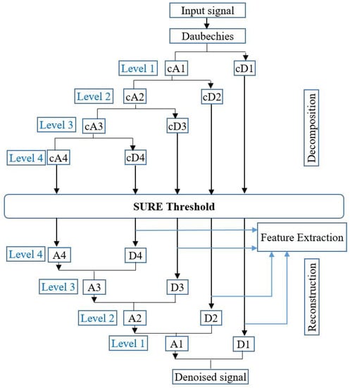 In order to decompose the EMG signal and achieve the optimal reconstructed signal, the family of Daubechies wavelets is considered for this work. However, we selected db4 to extract the high and low-frequency detail from the input signal without losing data. The decomposition levels were selected on the basis of the effective frequency of the signal and the effectiveness of the features obtained from the components of the individual wavelet. In this case, thresholds are important factors for extracting meaningful information using the technique of wavelet denoising [17,18]. Therefore, we used the SURE threshold, an adaptive threshold technique to determine the threshold limits of each level. When the threshold coefficients are extracted from each level, the noise effect of the input signal is removed. At each level, reconstructed signals are obtained using the inverse wavelet transform. Figure 3 depicts the process of generating restructured signals, where cAs and cDs are the coefficients of decomposition approximation and detail.