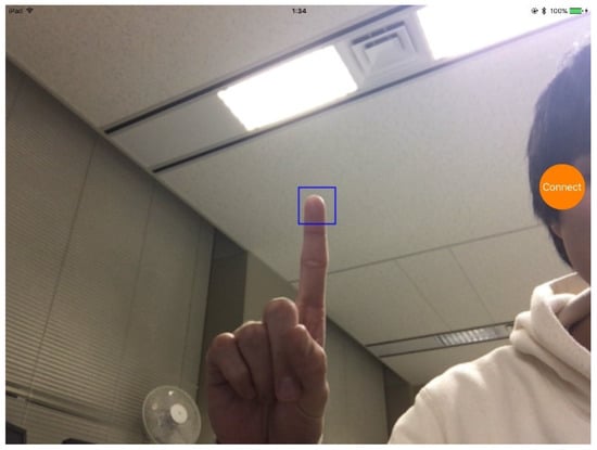 In this study, we used an iPad Air 2 (iOS 10.1.1) and a Myo Armband, and the environment was developed with Swift 3.0, Objective C, and XCode 8.3.2, respectively. Users had to register their fingertips in a rectangular frame of the screen, for example, shown in Figure 4. Therefore, the system displays a virtual keyboard for producing character. We applied the template-matching method for detecting the user’s fingertip. To consider the brightness, the input converts the RGB color image to the HSV color space. The coordinate of the finger is defined as R given as the following Equations (11)–(13).