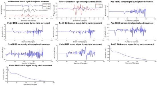 The Myo Armband device has a three-axis acceleration and a gyroscope that samples 50 Hz data at 8 bits and EMG sensor data at 8 bits giving 200 Hz. It has 8 PODs that use elastic material that fits for almost everyone’s hands, which can stretch from 19 cm to 34 cm. We have neglected the last two pods which have very little information related to this work. However, for these experiments, 3 axis accelerometers and gyroscopes and 6 EMG pod sensor data were collected. Twenty participants were asked to perform hand gesture actions such as double-tap, hold-fist, wave-left, wave-right and spread-fingers. The example of hand gesture functions is shown in Figure 7. Each function is performed approximately 7 times in 10 s and a total of 700 sample data were collected. The acquired data are transmitted over the computer via Bluetooth and stored in a database. Figure 8 shows examples of database signals.