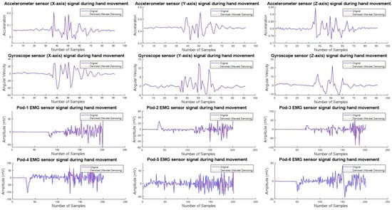 Due to the handheld features of the Myo Armband, reconstructing the input signal from the noise requires preprocessing to extract effective features. We used the wavelet denoising technique, which performs correlation analysis; therefore the output is expected to be the highest in the wavelet of mothers corresponding to most descriptions of the input signal. The wavelet techniques operate on a finite-length signal with the following processes: to get the noise data, to apply the waveform transform, and to obtain the denoised signal. By following Equations (1)–(3), we obtained the denoised signal to level 4 using , where the observations of x with noise is , the input signal , noisy signal and the standard deviation is . Figure 2 shows the steps of the preprocessing of the input signal.