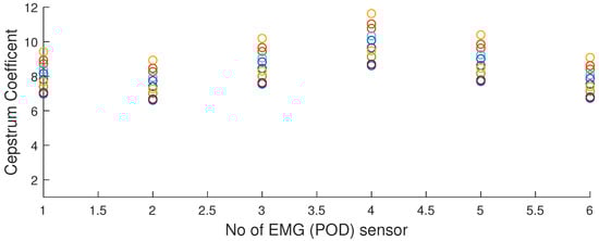 The Myo is used to acquire the EMG signal which includes eight built-in EMG sensors, . The EMG signals of each channel are obtained depending on the actions of the hand movement. In this work, we used the first six sensors to extract the feature of EMG. Cepstrum analysis was applied based on the spectral representation of the signal. However, the cepstrum method used for power spectrum analysis where the signal is seen as convolution to the source signal with a filter, therefore, we separated the source spectrum from the filter transfer function. Therefore, to achieve energy per unit of time by using power spectral analysis, . In the frequency domain, this convolution is multiplied by the corresponding Fourier transforms and used to measure the frequency spectrum, using Equation (7). This frequency spectrum is then used to obtain the power spectrum and its complex conjugate using Equation (8).