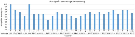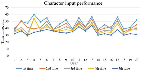 Furthermore, twenty random users were recruited to enter the characters from A to Z a total of five times to determine character input performance. Figure 13 presents an example of user performances. In this case, users need to perform a registered gesture to activate the virtual keyboard. Therefore, the system activates the virtual keyboard by displaying a blue dot in the area of the rectangle. However, the system only allows the user’s dominant hand to input characters on the keyboard. Figure 14 depicts the average recognition accuracy of the character input of all users. The average accuracy is 96.57% with the highest accuracy being 100% and the lowest being 93.85%. Figure 15 illustrates the character input performances in time. Performance for the fifth time is much better than the first to fourth and the average input speed of a character is 1.32 s for all users.